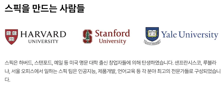 출처: 스픽 스픽은 하버드, 스탠포드, 예일 등 미국 명문대 출신의 창업자들이 ChatGPT를 개발한 OpenAI와의 협력으로 만들어진 AI 영어 회화 어플입니다. 국내에서 500만 다운로드를 기록한 인기 어플이죠. 이 어플은 영어 학습에 있어 '스피킹'에 중점을 두고 있으며, AI 영어 선생님과의 실시간 대화를 통해 영어 실력을 향상하는 것을 목표로 하고 있어요.