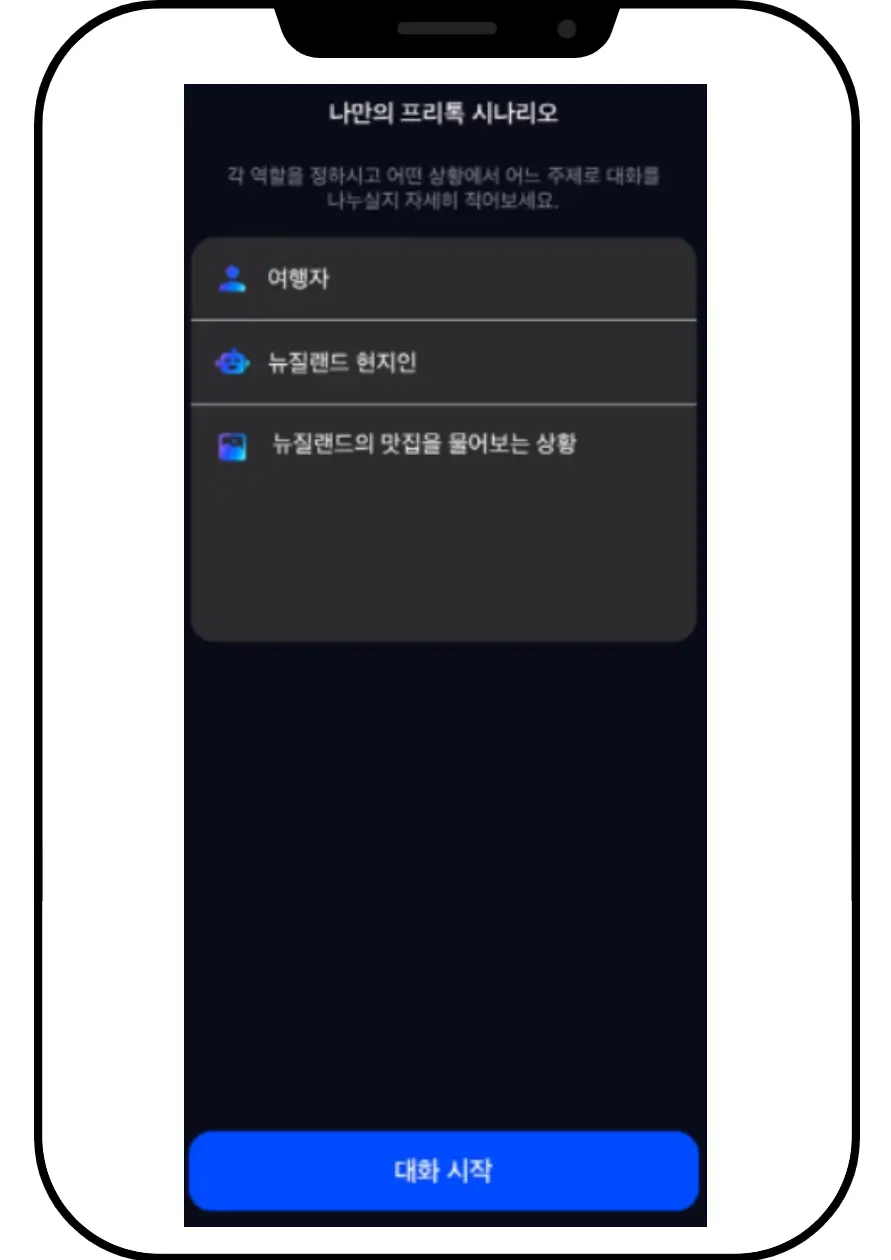 스픽 프리톡 스픽 어플에는 '나만의 프리톡 시나리오' 기능이 있는데요. 내가 연습하고 싶은 상황을 AI 선생님과 함께 연습할 수 있는 기능입니다. 저도 최근에 뉴질랜드 여행을 앞두고 프리톡 기능을 이용해서 다양한 상황을 연습했고, 실제 여행 중에 연습했던 표현들을 막힘없이 사용했던 기억이 있습니다.