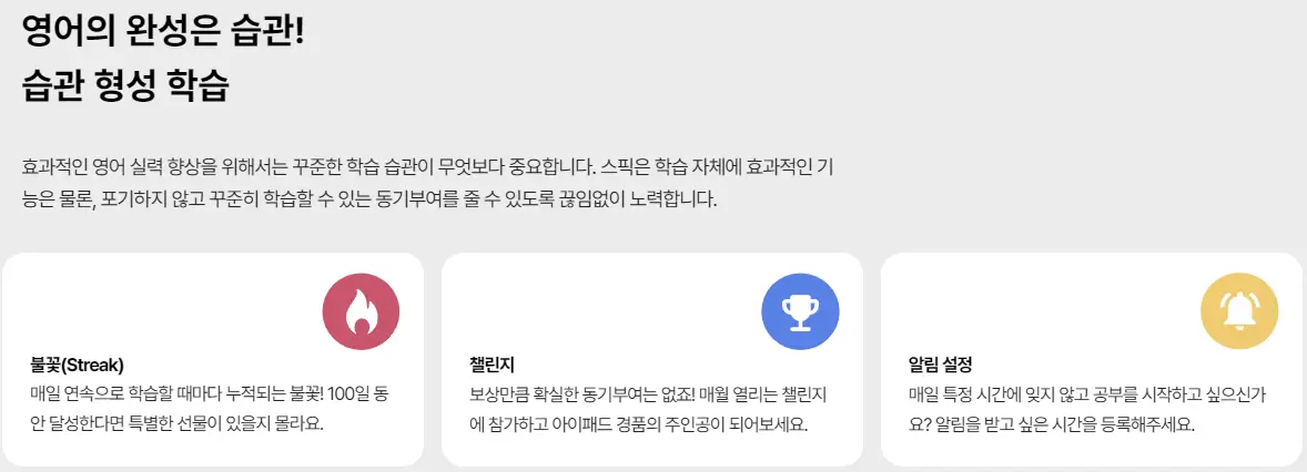 출처: 스픽 영어 공부를 하면서 가장 어려운 점이 꾸준하게 영어 공부를 하는 것인데요. 스픽을 이용하면 나도 모르게 영어 공부를 하고 있는 나를 발견하실 수 있을 거예요. 스픽은 매일 사용자가 자주 공부하는 시간대에 알림을 보내주고 영어 공부를 하면 불꽃이 연장됩니다.