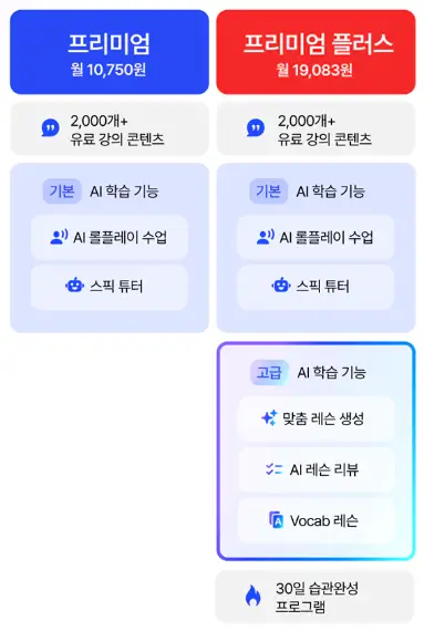 스픽은 '프리미엄'과 '프리미엄 플러스' 두 가지 강의 종류를 제공합니다. 두 가지 강의 모두 원어민 기본 강의와 AI 튜터 기능, 프리톡 대화, 채팅을 사용할 수 있습니다. 프리미엄 플러스의 경우는 1:1 수업 피드백과 AI 맞춤 수업 형성 기능이 추가됩니다!