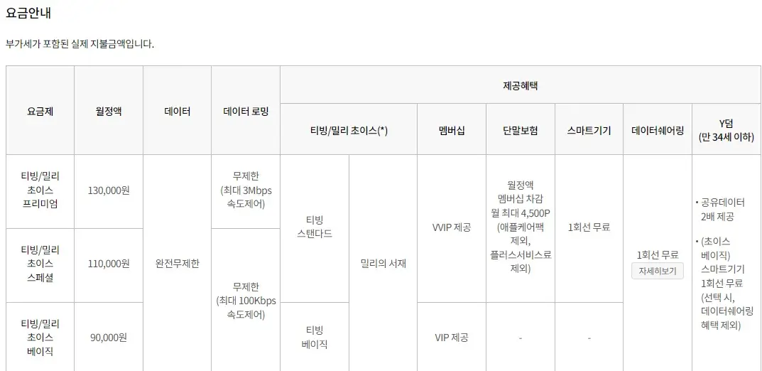 출처: KT 티빙/밀리 초이스 베이직 요금제를 사용하면 월 9만 원에 무제한 데이터는 기본으로 사용하면서 티빙과 밀리의 서재까지 무료로 이용할 수 있어서 추천드립니다!