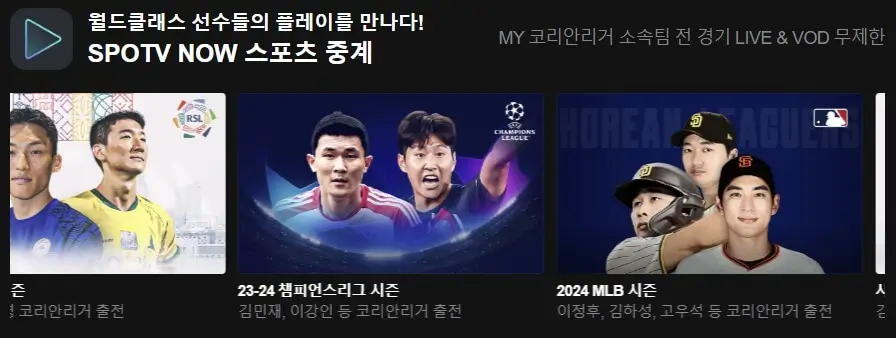 출처: 네이버 평소에 스포츠 경기를 챙겨보시나요?? 저도 스포츠 중계를 너무 좋아해서 중요한 경기는 챙겨보는 편인데요! 요즘 외국에서 왕성하게 활동하고 있는 한국 선수들이 많아져서 볼거리가 풍부해진 것 같습니다. 스포티비 콘텐츠를 선택하시면 코리안리거 소속팀의 전 경기 LIVE와 VOD를 무제한으로 시청하실 수 있습니다.