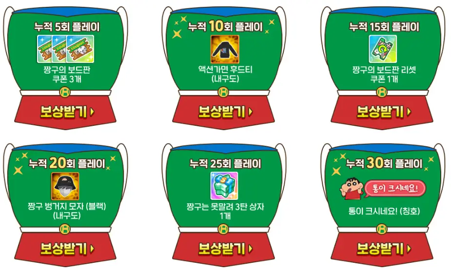 ✔️ 누적 15회: 짱구의 보드판 리셋 쿠폰 1개