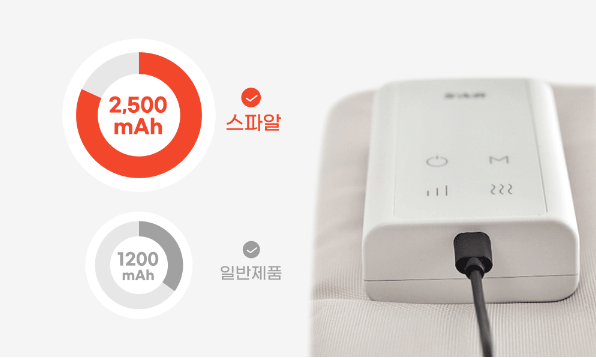 출처: 스파알 스파알 포터블 종아리 마사지기에는 국내 최대 용량인 2500mAh 배터리가 탑재되어 1회 충전만으로도 오랫동안 마사지를 받아볼 수 있는데요.