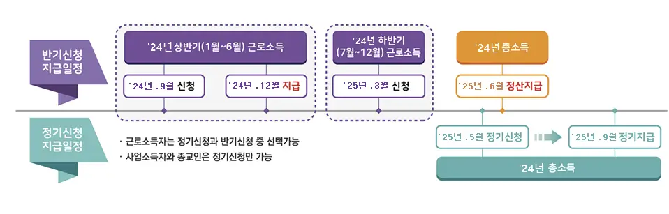 상반기분 지급액이 15만 원 미만인 경우에는 12월 말에 지급되지 않고 다음 해 6월에 정산되고 근로소득 외에 다른 소득이 있으신 분들은 반기 신청을 하더라도 정기신청으로 간주되니 신청 시 참고해 주세요!