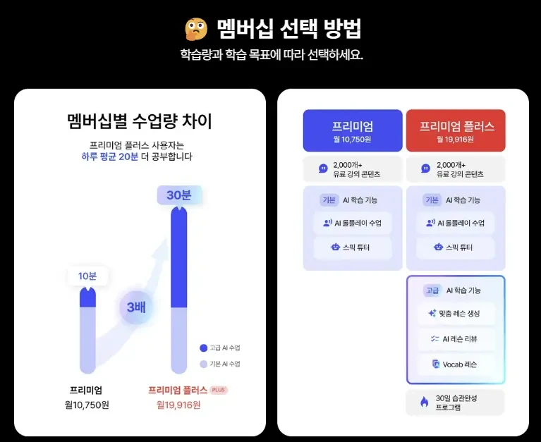 출처: 스픽 스픽에는 프리미엄과 프리미엄 플러스 두 가지 멤버십이 있는데요. 프리미엄 플러스는 고급 AI 학습 기능을 포함한 맞춤 레슨 생성, AI 레슨 리뷰, 30일 습관완성 프로그램 등이 포함되어 있어 더 많은 혜택을 누릴 수 있습니다.