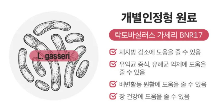 출처: 센트룸 BNR17의 정확한 명칭은 락토바실러스 가세리 BNR 17로 한국인의 모유에서 분리 배양한 유산균인데요. BNR 17은 체지방 감소에 도움을 줄 수 있는 원료로 유산균 중에서는 국내 최초로 식약처의 정식 인정을 받았습니다.