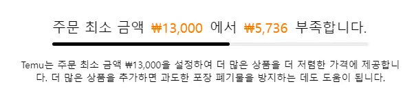 출처: 테무 실제로 확인해 보니, 최소주문금액인 13,000원을 초과해야지 무료배송이 가능했습니다. 하지만 해외배송이라는 걸 감안했을 때 최소주문 금액이 있는 건 합리적이라고 생각했습니다. 1~2천 원짜리까지 모두 무료배송이 되면 지속적으로 운영이 어려울 테니까요.