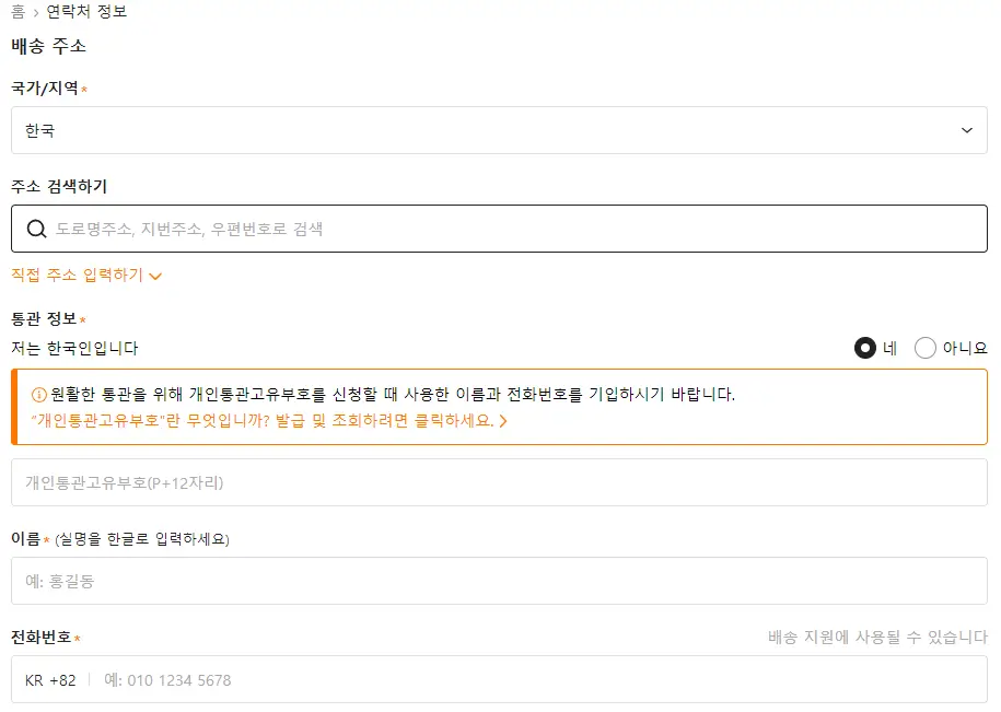 결제하기를 누르면 아래와 같이 거주하는 국가, 배송받을 주소, 개인통관고유부호, 이름, 전화번호 정보입력이 필요합니다. 국내쇼핑몰과 동일하게 처음 구매하실 때 한 번만 입력해 주시면 됩니다.