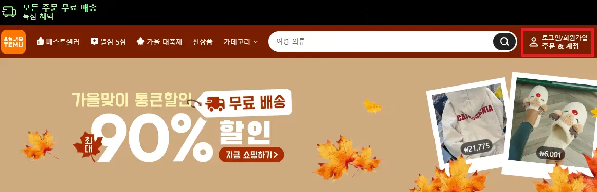 테무 홈페이지에 들어가면 아래와 같이 로그인/회원가입이 보이실 텐데요. 아래 절차에 따라 회원가입을 진행해 주세요.