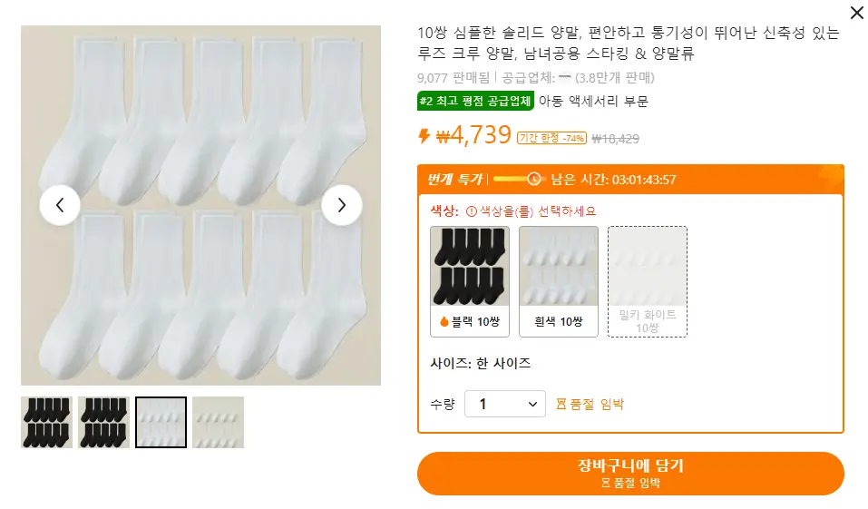 출처: 테무 테무를 통해 구매하려는 제품들을 장바구니에 담고 결제하기를 눌러주시면 되는데요. 품절이 임박한 상품이 있으면 품절 임박 알람도 띄어주더라고요. 처음에는 아래처럼 품절 임박한 상품들이 너무 많아서 홈쇼핑처럼 품절 임박이 아닌 상품에도 품절 임박이라고 하고 판매를 유도하는 상술이 아닌지 의심했는데요.