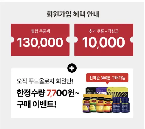 출처: 푸드올로지 푸드올로지 구매를 고민 중이시라면 반드시 공식 홈페이지에서 신규 회원가입을 하고 웰컴 쿠폰팩과 추가 쿠폰은 꼭 받아서 사용하시는 걸 추천드립니다! 무려 14만 원에 상당하는 쿠폰을 가입만 해도 지급해 주는데요. 저도 이 쿠폰을 사용해서 저렴하게 구매했습니다!