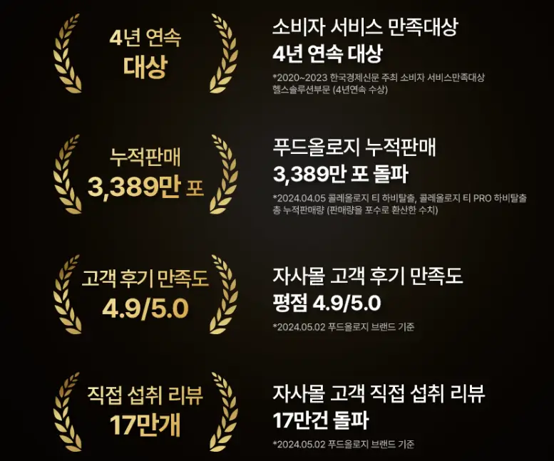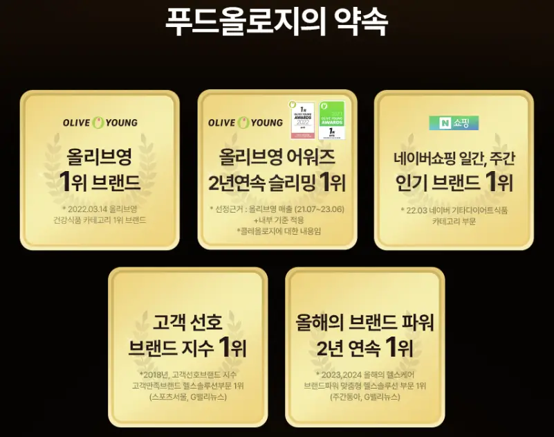 출처: 푸드올로지 푸드올로지는 2018년에 처음으로 콜레올로지를 출시한 이후로 지속적인 리뉴얼과 제품 개발을 통해 성장 중인 브랜드인데요. 고객 선호 브랜드 지수 1위, 올해의 브랜드 파워 2년 연속 1위, 4년 연속 소비자 서비스 만족대상 등 많은 곳에서 인정받고 있는 브랜드입니다.