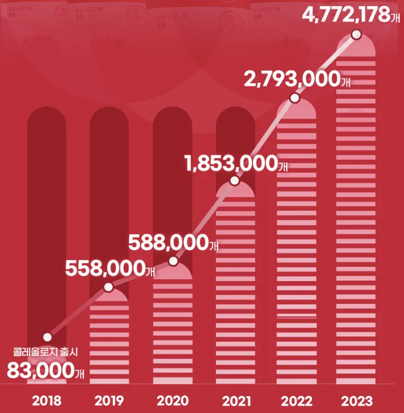 출처: 푸드올로지 푸드올로지의 대표 삼품인 빨간통 다이어트 콜레올로지의 경우 지속적인 리뉴얼을 통해 현재 4차 리뉴얼 제품인 콜레올로지 컷 PRO 제품이 출시되었는데요. 23년에는 무려 4,772,178개나 판매가 되었다고 합니다! 많은 사람들이 계속 찾아주는 이유가 있겠죠?