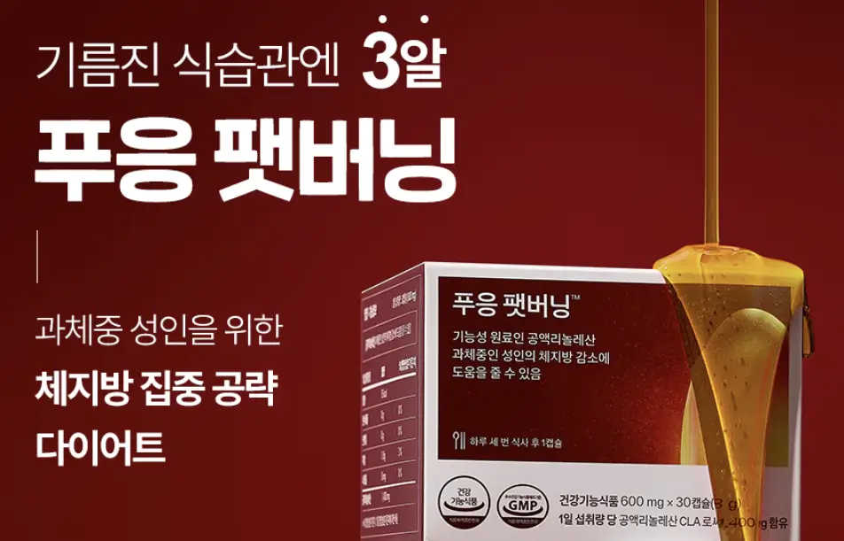 푸응 팻버닝은 다이어트 보조제로 유명한 닥터블릿에서 출시한 제품으로 체지방 감소에 효과적인 다이어트 보조제인데요. 푸응 팻버닝의 주성분은 공액리놀레산(CLA)이라는 기능성 원료로 체지방 감소에 효과적이라는 연구 결과가 있는데요.