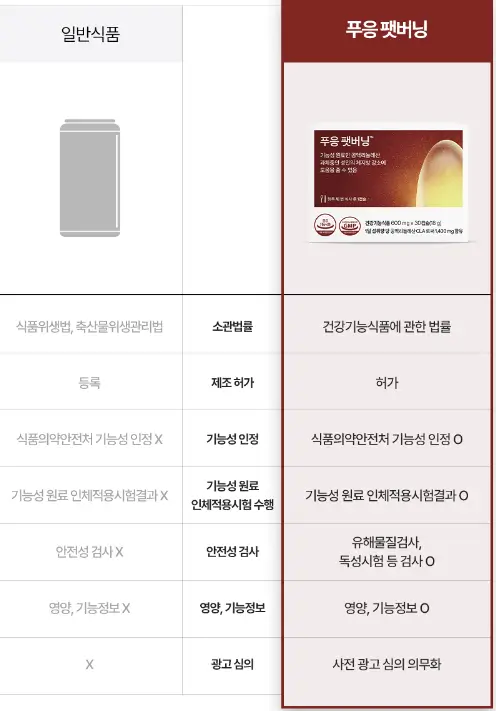 푸응 팻버닝의 주원료인 CLA(공액리놀레산)는 오메가 6 지방산의 일종으로 체중 감량을 지원하는 건강한 지방산인데요. 식품의약품안전처에서 과체중 성인의 체지방 감소에 대해 기능성 원료로 인정받았습니다!