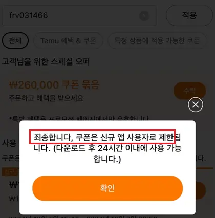 바로 제가 그런 케이스였는데요. 저는 기존에 테무 앱을 이미 받아놓고 가입은 하지 않은 상태라 괜찮을 줄 알았는데 위와 같은 팝업이 뜨면서 할인 쿠폰을 적용받을 수 없었습니다.