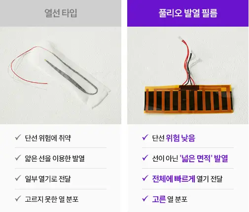 그리고 풀리오의 경우 열선 타입이 아닌 발열 필름 타입이 적용되었는데요. 열선 타입과 다르게 단선의 위험이 낮고 넓은 부분 전체에 빠르고 고르게 열전달이 가능하다고 합니다.