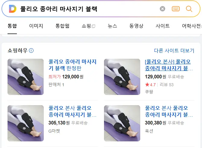 무려 45% 할인된 금액인 109,000원에 구매할 수 있는 걸 확인할 수 있어요. 그럼 검색을 통해 풀리오 종아리 마사지기 블랙 인터넷 최저가를 알아볼게요.